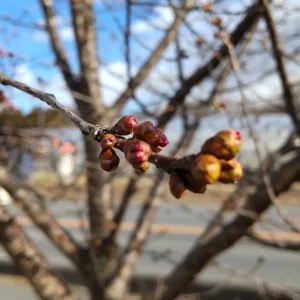 啓蟄が過ぎ、一か月遅れの春一番も吹きましたね。一か月遅れって驚きですね。当園のオカメサクラもピンクの蕾が見えてきました。
